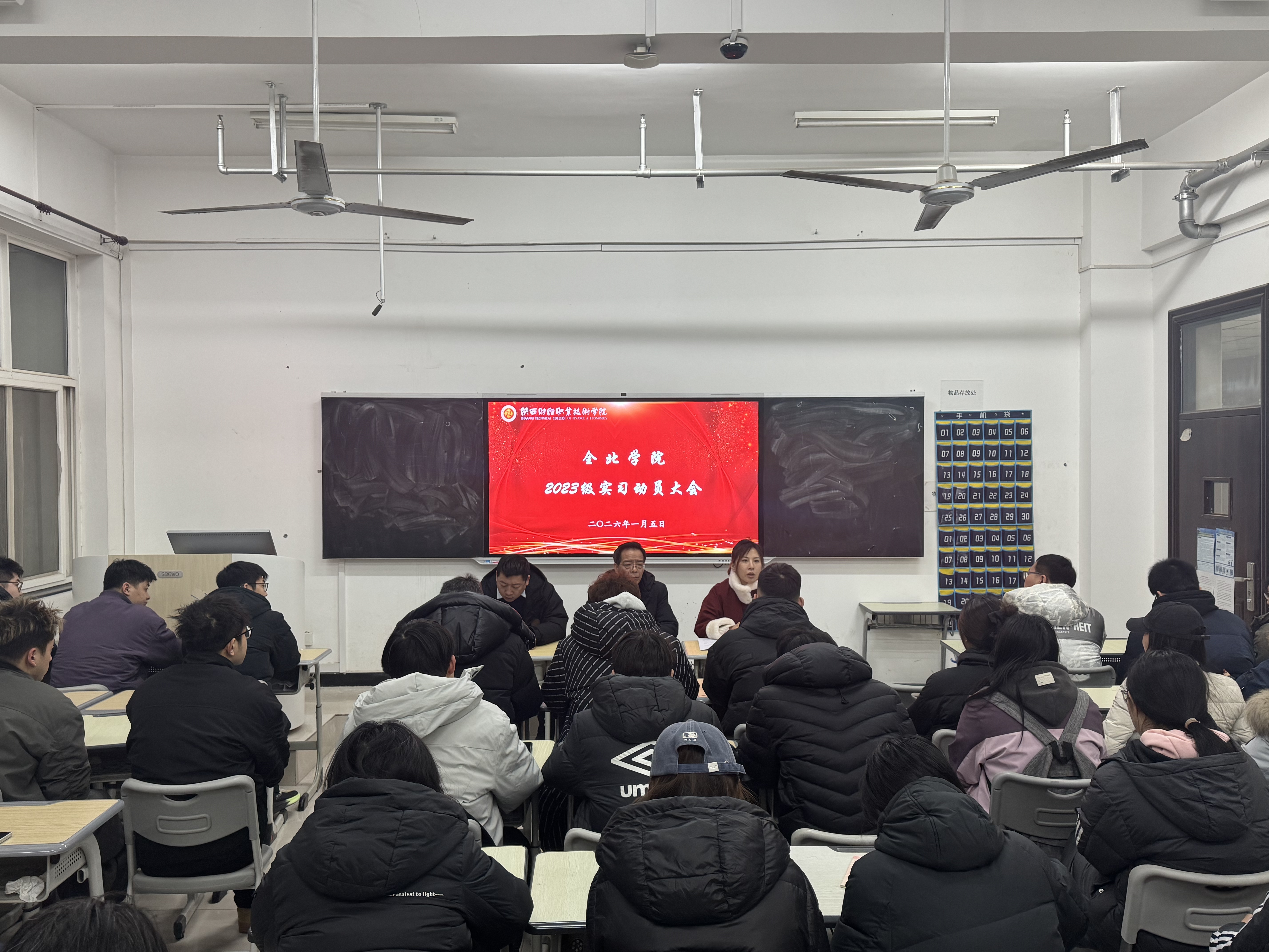 为扎实做好全北学院2023级学生实习组织与管理工作,引导学生明确实习目标,提升实践能力与职业素养,确保实习工作安全、有序、高效开展,1月5日晚七点半在722教室召开2023级学生实习动员大会。全北学院党支部书记兼副院长雷剑、学生科副科长孟琰峰、办公室副主任樊凡、2023级全体学生参加了大会。大会由全北学院党支部书记兼副院长雷剑主持。
